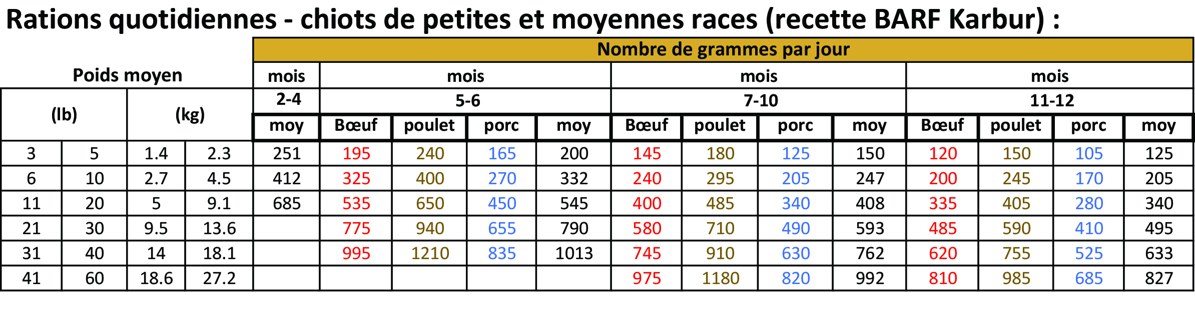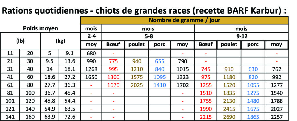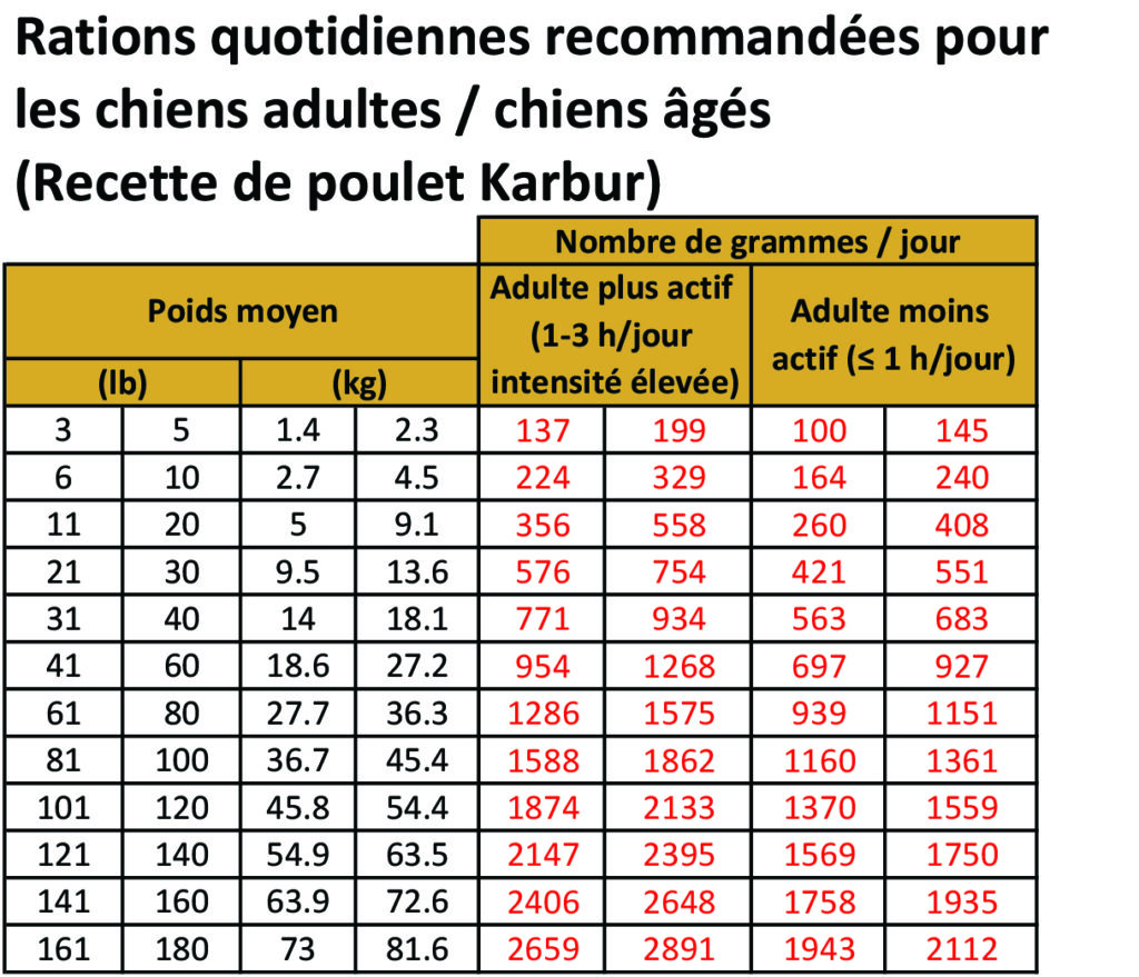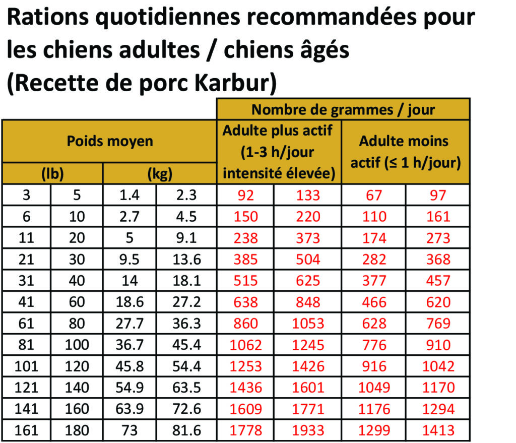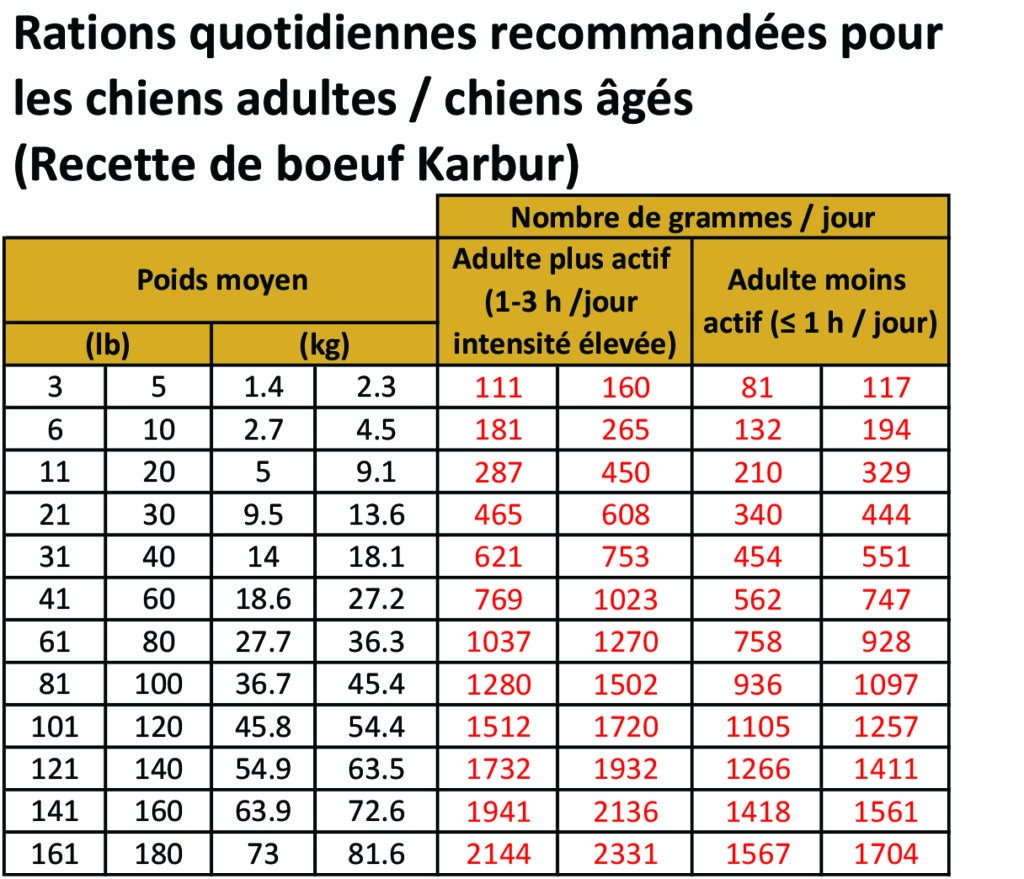 Vous trouverez ci-après les tableaux de rations quotidiennes de nourriture crue Karbur à administrer à votre chien selon son cycle de vie, son âge, son poids et son niveau d’activité.