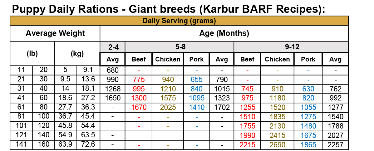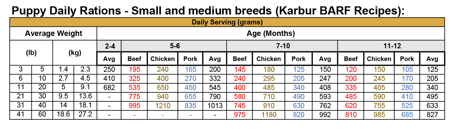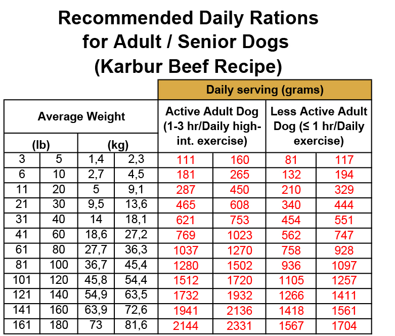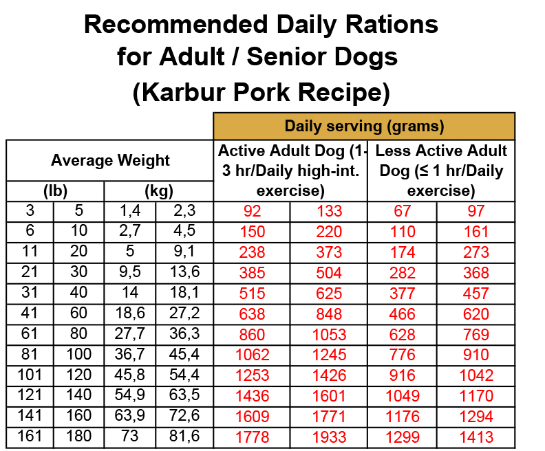 You will find below the Karbur raw food daily ration charts for your dog, based on their age, weight, and activity level.