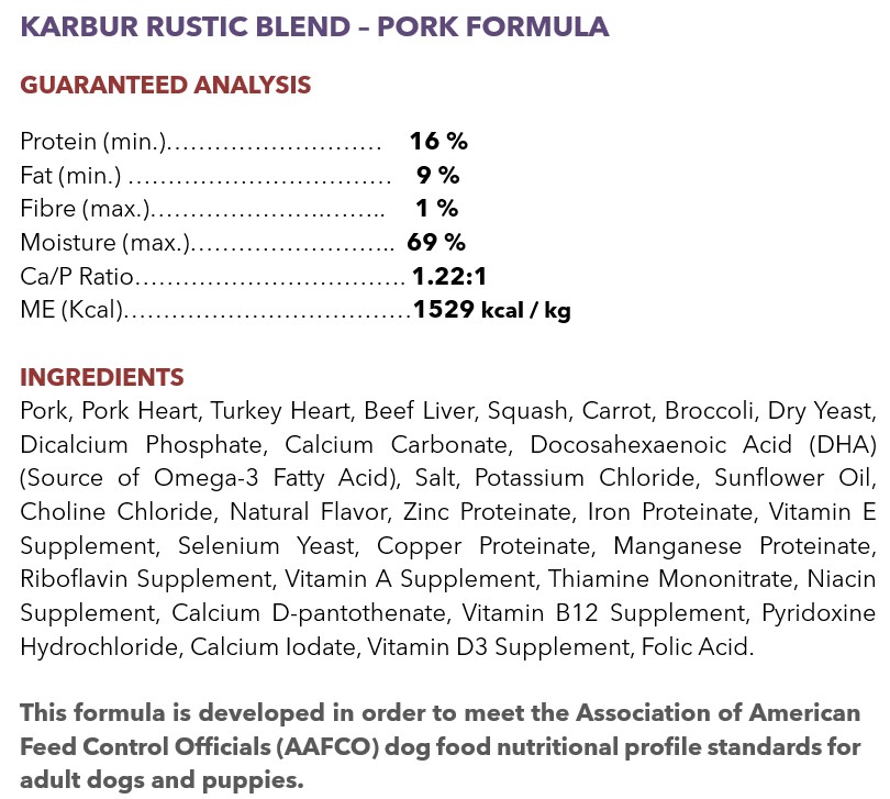 Complete Raw Food Formula consisting of Pork Meat, Pork / Turkey / Beef Organs, Vegetables, Vitamins, Minerals, and Omega-3 Fatty Acids (for Adult Dogs & Puppies).