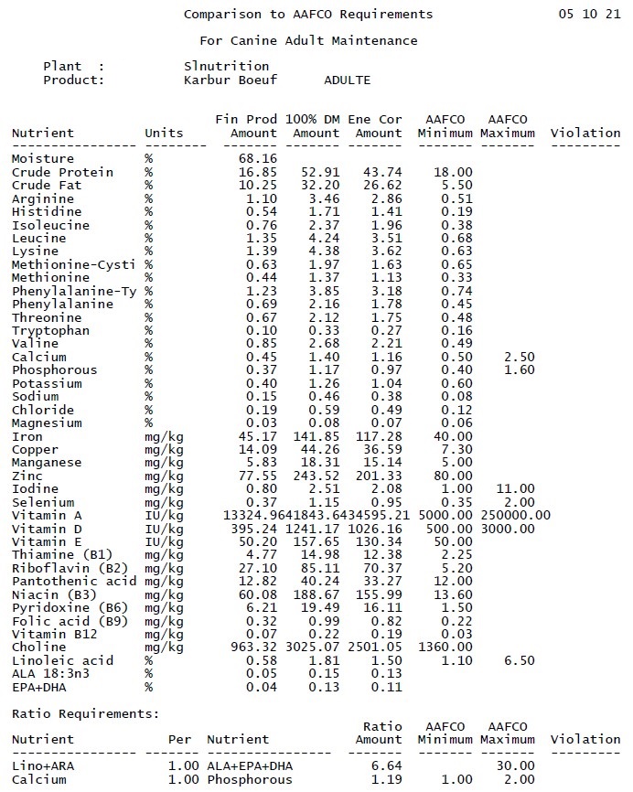 • Cet aliment est formulé pour répondre aux normes du profil nutritionnel établies par l’Association of American Feed Control Officials (AAFCO) pour le chien adulte (Tableau comparatif de l’AAFCO fourni dans la galerie photos)