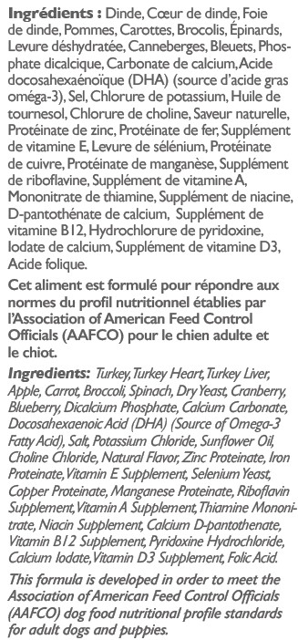 Formule complète et équilibrée comprenant de la viande de dinde, abats, fruits, légumes, vitamines, minéraux et omégas-3 (pour chiens adultes et chiots).